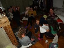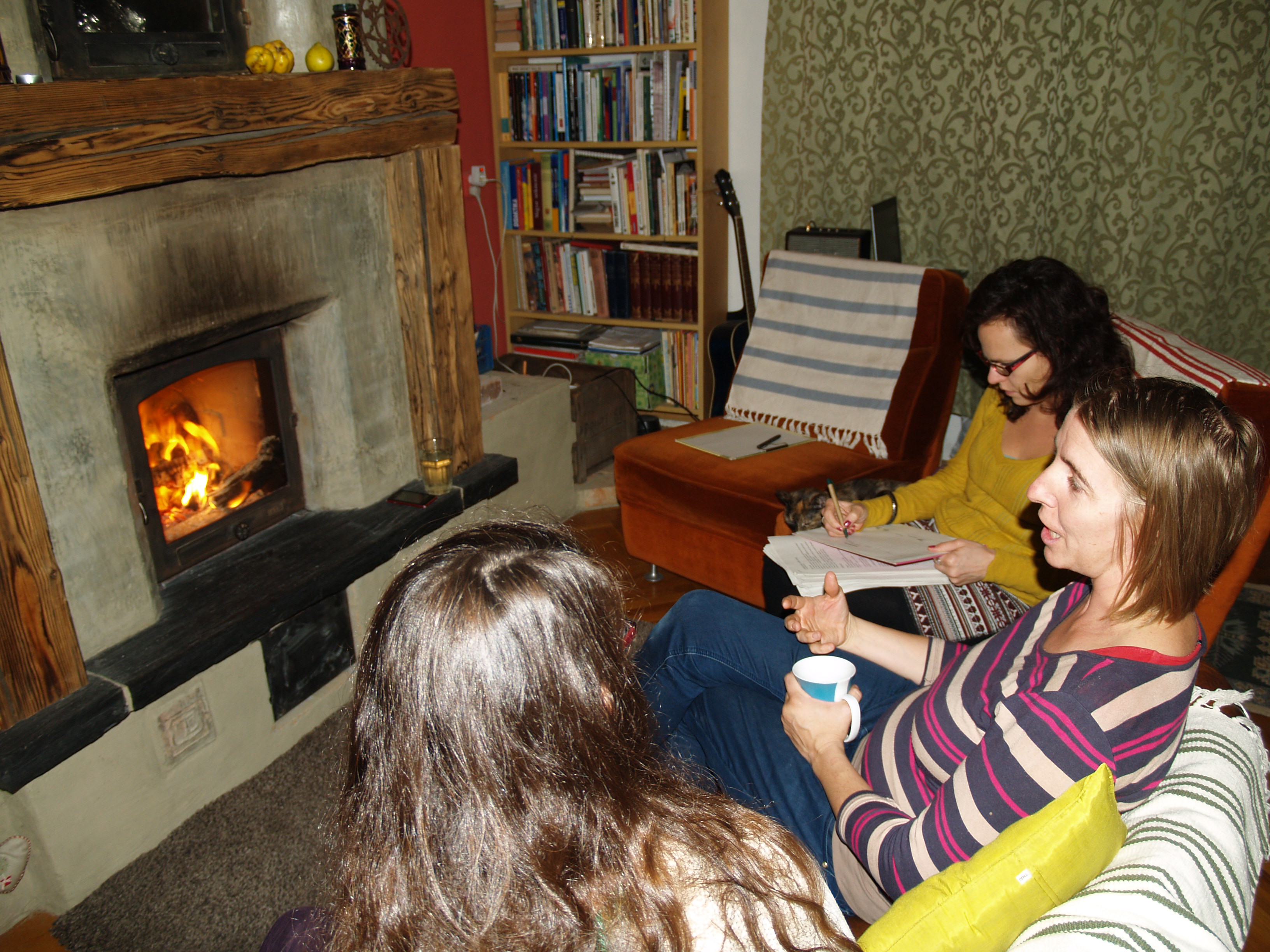 Annak érdekében, hogy minél szebb, minél jobb legyen a könyv, olvasási próbának vetettük alá a mesék egy részét. Összejöttünk Traceyék házában, leültünk a kályha elé, amelyben lobogott szépen a tűz, magunk mellé vettük a doromboló macskát, s mivel Áginak pont van egy délceg kis porontya, na őt is bevetettük. Ettünk-ittunk, olvastuk fel a történeteket felváltva, meghatódtunk, hogy Timiből mesehős lett, aztán jól megpozitívkritizáltuk a műveket és szegény Kinga, azóta csak húz, csak húz... de meglátjátok, jócskán marad is belőlük!