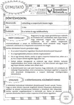 Nagyszerű, ha egy csoport gördülékenyen működik és mindenki érti a működését, ezért olyan fontos, hogy eldöntsük, hogyan hoz döntéseket a csoportunk. Ha ezt időben megtesszük, minimalizálhatjuk a zavart és konfliktusokat, mivel mindenki tudja, hogyan születnek a döntések és e folyamatok részesének érzi magát. Ez az útmutató ismertet különféle döntéshozatali módokat, melyeket különféle helyzetekben használhatunk, valamint felsorolja a döntéshozatalt elősegítő és nehezítő viselkedést.
