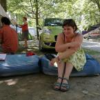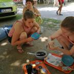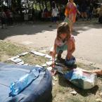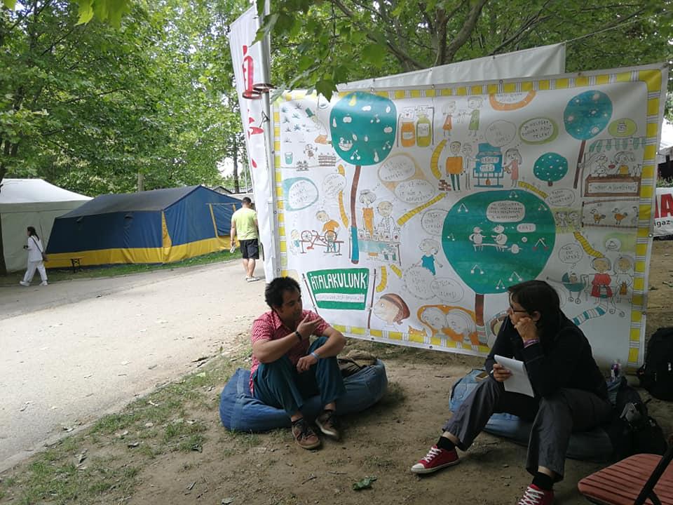 A sátrunk gyermek barát volt. Vica a TÉGY egyesület, a lókúti átalakuló közösségek képviseletében a pici Vilmossal és Ági pedig Hannával mesélnek egy érdeklödőnek az átalakuló közösségekről.