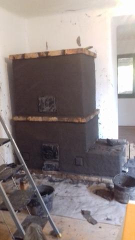 És a kész kályha, vakolva, padkával és fatárolóval.