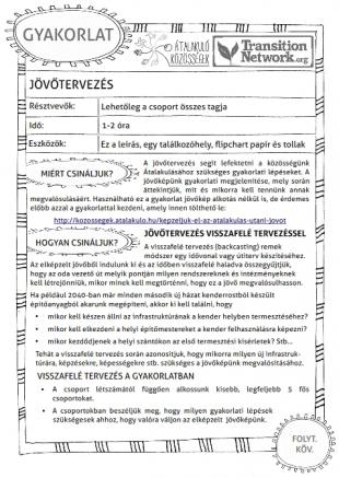 A jövőtervezés során egy olyan menetrend készül, mely segít megtervezni a közösségünk Átalakulásához szükséges gyakorlati lépéseket, meghatározva, hogy mit és mikor kell megtenni. Ez az útmutató elmagyarázza, hogyan készíthető ilyen útiterv, mely végigkísér az Átalakuláshoz vezető utunkon.