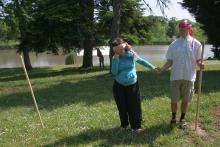 Másnap a reggeli készülődés és elpakolás után az egész csapat levonult a közeli kastély parkjába, és a festői környezetben egy kültéri játék segítségével gyakorolhattuk a különleges szituációk eredményes megoldásához szükséges gyakorlati együttműködést. A kitűzött játék lényege, hogy egy látó, de mozgásképtelen, kommunikációjában korlátolt (mindent ért de csak igen-nem válaszokra képes) embernek kellett összehangolnia két nem látó, de teljesen mozgás- és kommunikáció képes emberrel alkotott csoport munkáját, melynek eredményeképp közösen eljutnak egy kijelölt pontra. Ehhez össze kellett szedniük egy hordágyhoz szükséges két fát, lepedőt, ezekből hordágyat kellett készíteni, ezen kellett a nem látót a célba eljuttatni, ráadásul még egy elszórt iratot is be kellett gyűjteni. Igen hamar kiderült, mennyire fontos az eredményesség szempontjából a megfelelő szintű kommunikáció és a stratégiák mielőbbi kidolgozása. A korlátolt kommunikációs lehetőség míg egyeseket megbénított, másokat kreatív megoldások kidolgozására sarkallt.