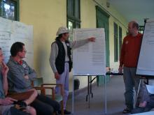 Az eredményeket előbb kiscsoportban megbeszéltük, majd mindenki előtt prezentáltuk. Az összefoglalás érdekében a jelenlévőket két csoportra osztva a megbeszélések jellemzőit és folyamatait írtuk össze három kérdéskör mentén, majd kérdésenként a két csapat egy-egy tagja párbajszerűen ismertette a meglátásokat.