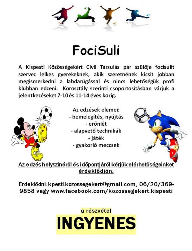 A Kispesti Közösségekért Civil Társulás pár szülője gondolt egyet, és foci sulit kezdett szervezni. Mint kiderült, egy hiányt tölt be ez a "suli" , aminek létrehozása sok mindenkinek megfordult már a fejében. Lelkes gyerekeket várunk, akik szeretnek focizni, de nincs lehetőségük profi klubhoz járni edzeni. Segítőink, önkénteseink is akadnak szép számmal, sőt támogatókra is szert tettünk már. Az edzések, azaz a foglalkozások a gyermekek számára ingyenesek!!