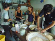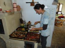 Volt is itt aztán minden: ki-ki meggyúrta a maga kenyerét, amit közösen ettünk meg reggel, délben, este – bármikor. Mézzel, vajjal, lekvárral, magában. Ki talicskát tolt - komposzttal, kaviccsal rakottan -, ki a cuclit nyomta a kecskekölkök szájába, amíg a másik az erdőkertben tüsténkedett. Meglátogattuk a magbankot, és gondnokát, Máriát, aki bár nem könnyezett, mégis csoda egy nőszemély.