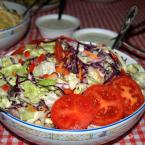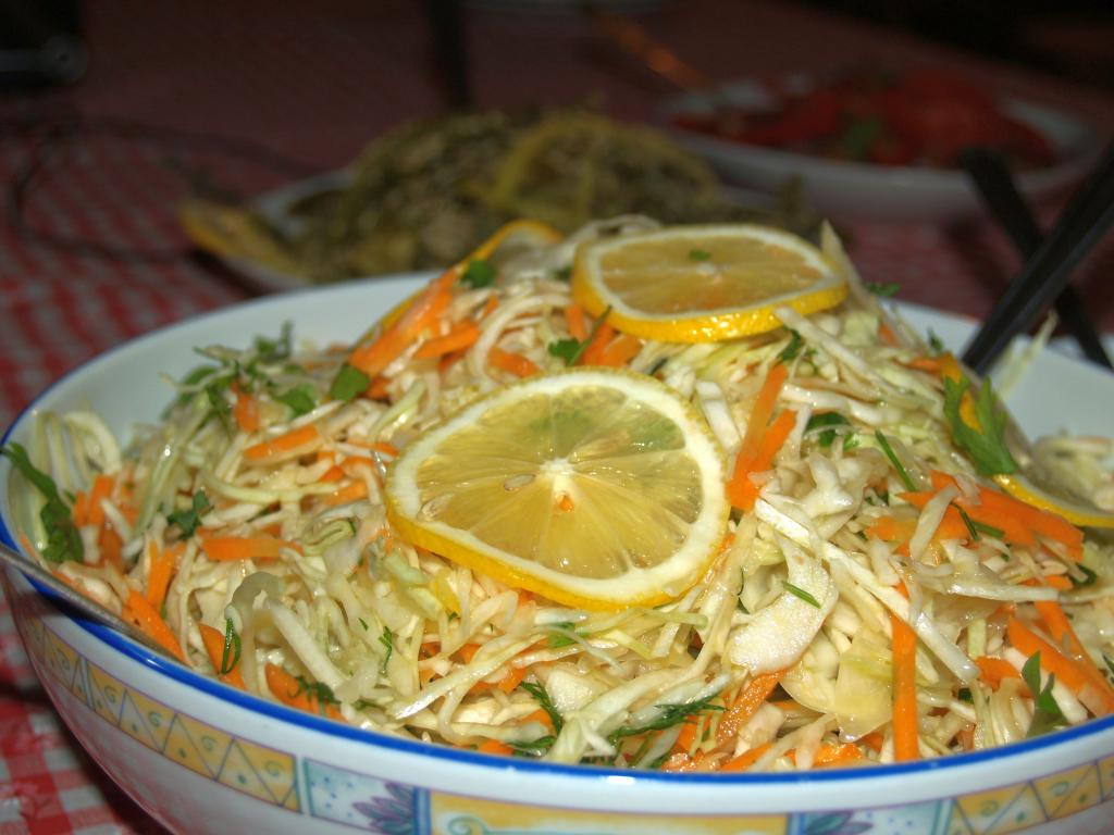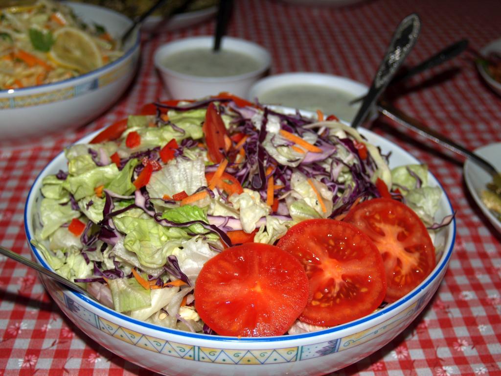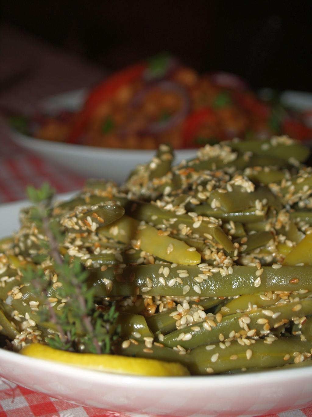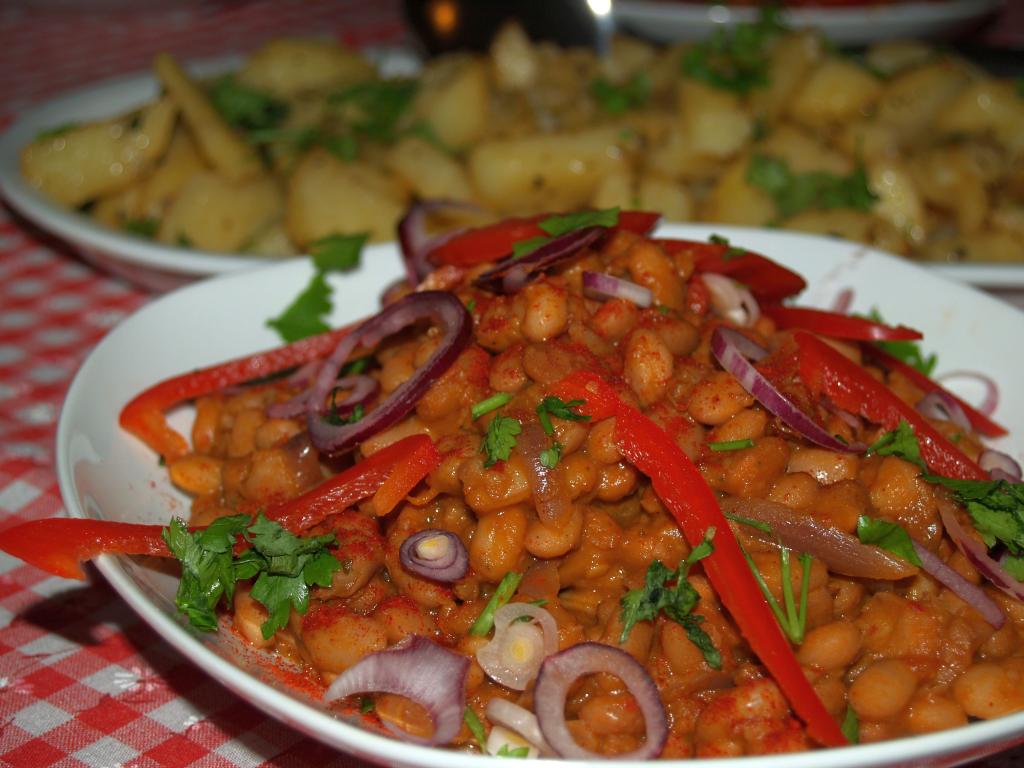 Ezért készült a kunbábonyi földben termett sütőtökből a csípős gyömbéres krémleves, mely a tél végén melegítő hatással van szervezetünkre. A tepsiben sült lilahagymás, paradicsomos bab igazi téli étel, vegáknak gazdag fehérjeforrás. A paradicsom, darált paprika, a fűszeres szósz, amivel összesült a közösségi kert termése, és a szövetkezeti tagok keze munkája. A szezámmagos zöldbab szintén a kertünkől származik: a tavalyi év csúcstermése, fűszerkerti kakukkfűvel. Az idénysaláta minden étkezés kihagyhatatlan eleme, főleg, ha a hozzávalók a leszedés utáni egy órán belül már a tányéron vannak (...ez most nem így történt, de majd nyáron...). A fokhagymás, citromos tepsis krumplival és a tzatzikivel egy kis görög hangulatot volt szándékunkban csempészni a résztvevők lelkébe.