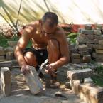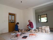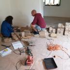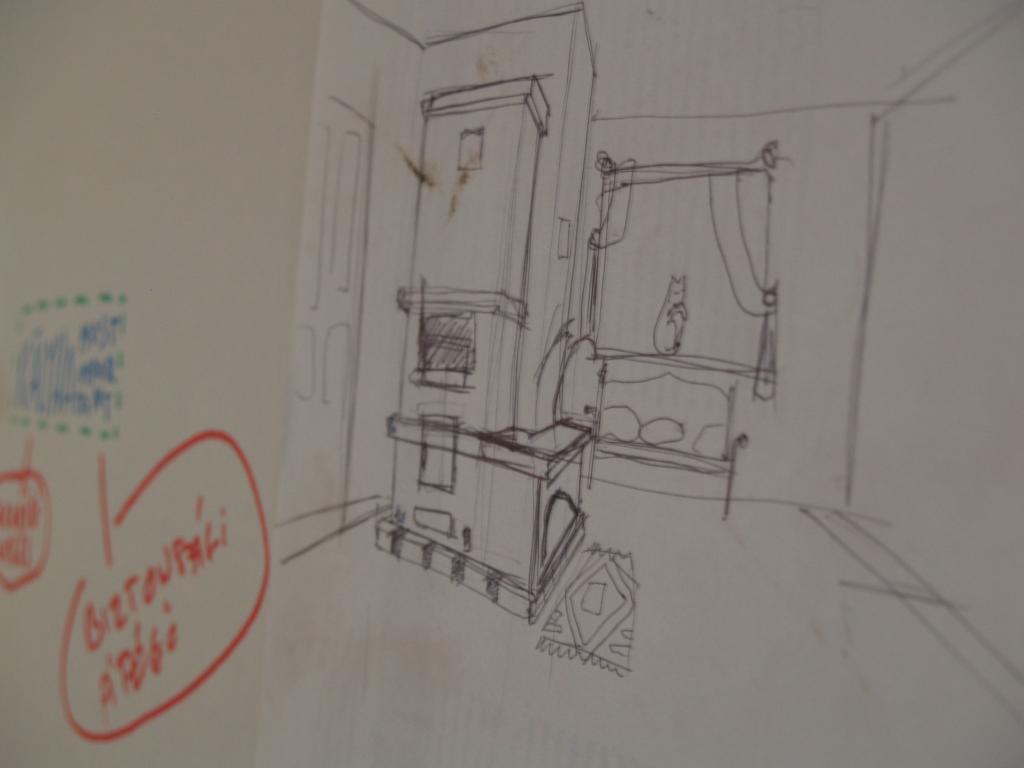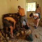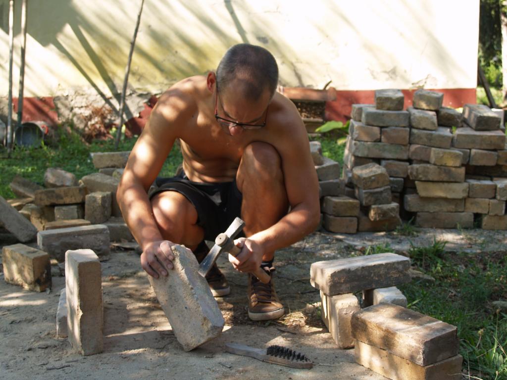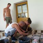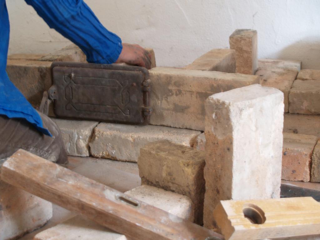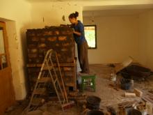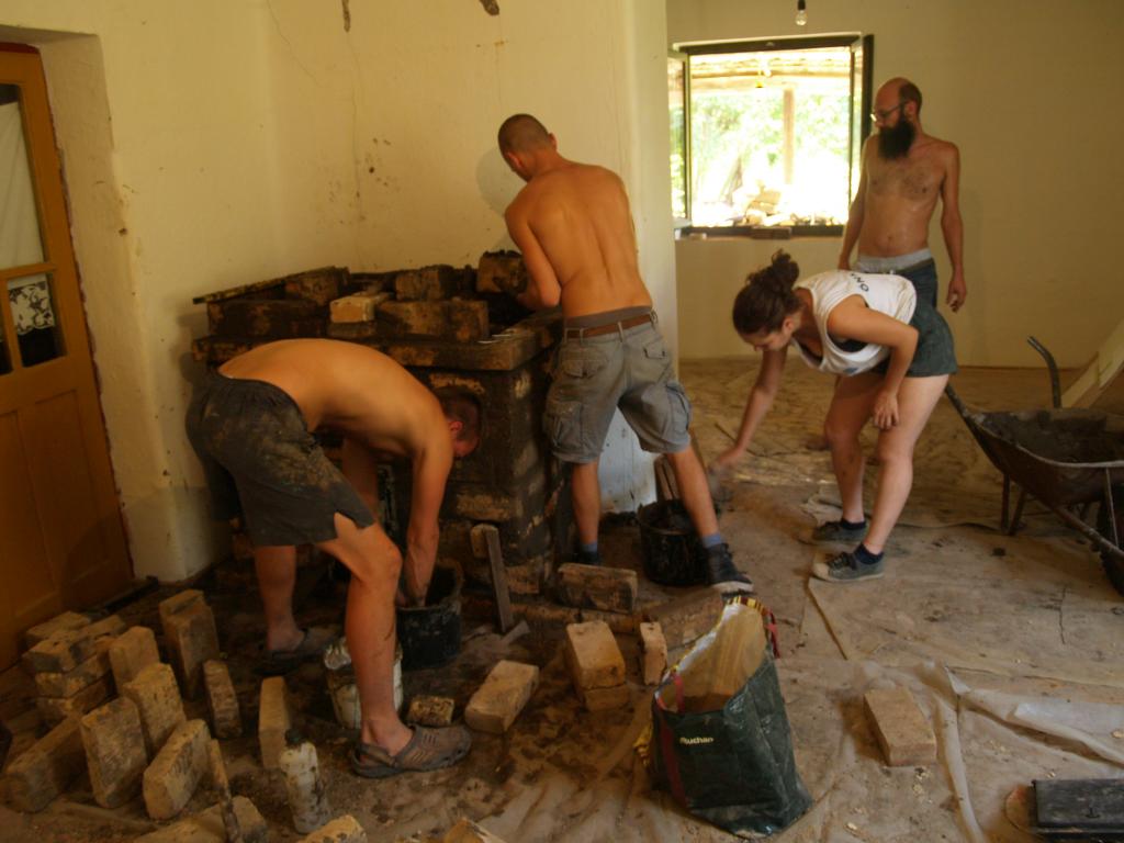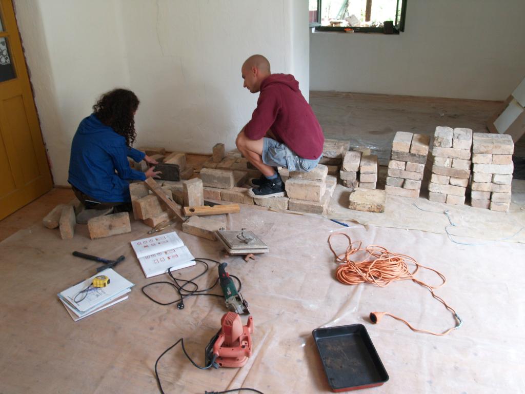 A folyamat, amire az egész ottlétet felfűztük: egy kályha építése volt. Feldmár Nóra tartotta a kezében a folyamatot a tervezéstől a megvalósításig. Az elképzelése az volt, hogy a létező leghatékonyabb fűtést hozza ki a rendelkezésre álló anyagokból. Az alapkészlet a szín mélyén talált kályhaajtó illetve hamuzóajtó volt. Még a múlt évben sikerült egy szomszédságban elbontásra szánt épület vályogtégla törmelékére szert tenni, ebből készült a vályogmassza, illetve ugyancsak a közelben élő asszonyság egyik bontásra ítélt kulipintyójából lett a kályha teste.