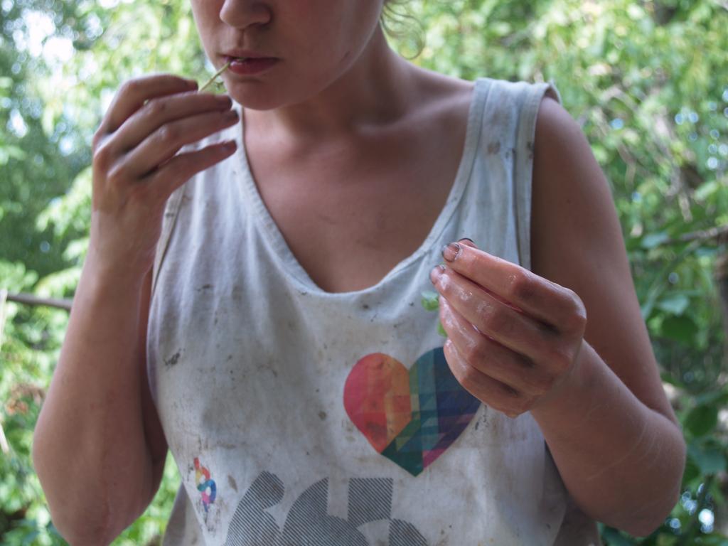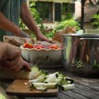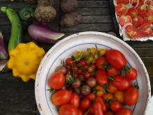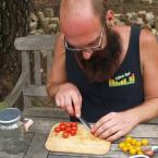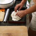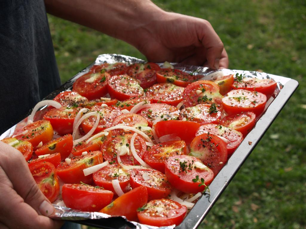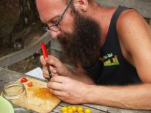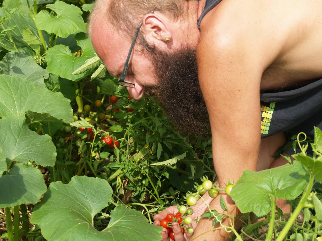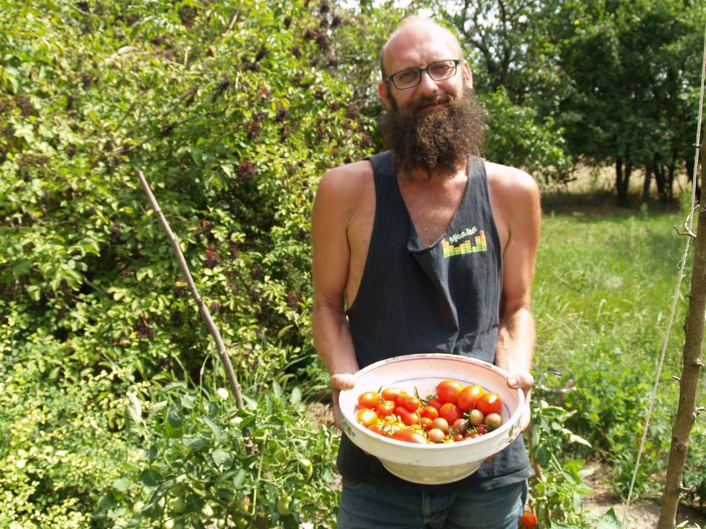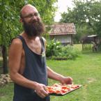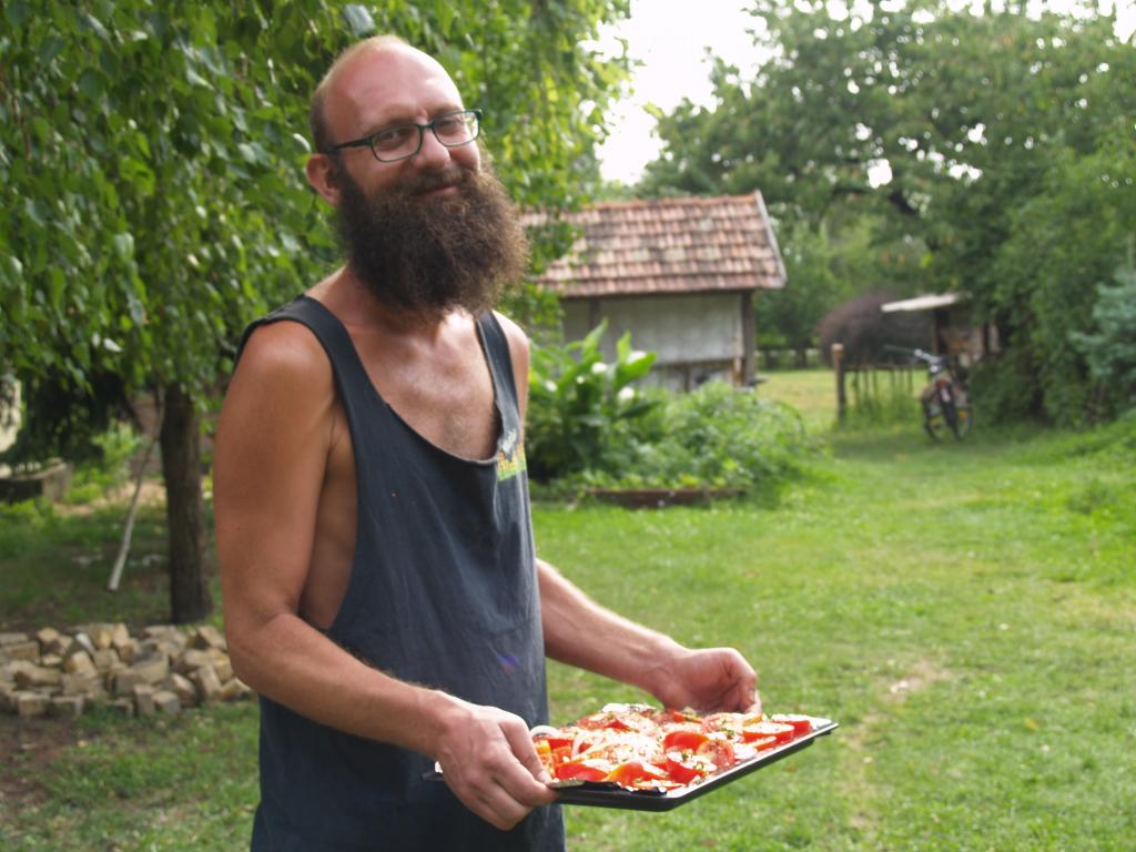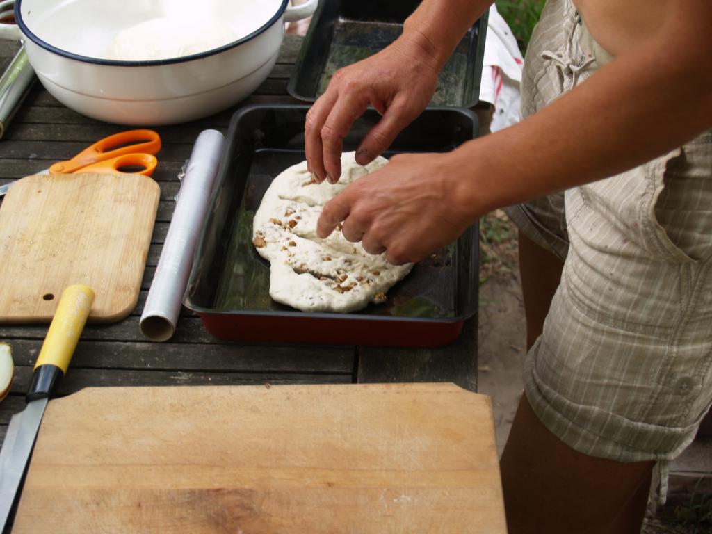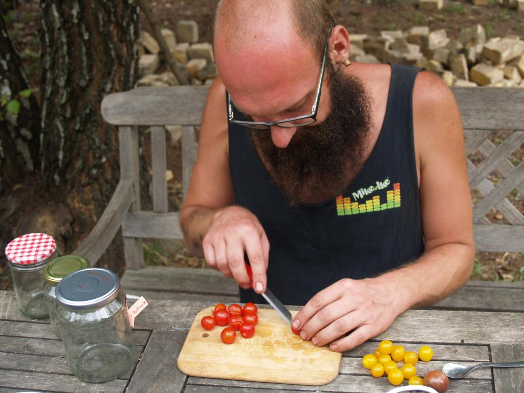 Szinte elképzelhetetlen bármiféle megmozdulás tanyasi környezetben a helyben termelt élelem témáját megkerülve. Nemcsakhogy körbejártuk, de szinte pancsoltunk benne. A kertből szüretelt hozzávalókból készült a reggeli és a vacsora, illetve egy másik helybeli termelő is hozzájárult a kulináris élvezetekhez: ő is vegyszermentesen gazdálkodik, plussz remekül főz. Volt kenyérsütő műhelymunka, komposzttea kezelés a kertben, paradicsom magfogás tájfajta fenntartáshoz illetve paradicsom és szilva aszalás, bodzaszüret, ami jön ilyenkor. (Még cefrézés is, de ezt csak halkan mondjuk.)