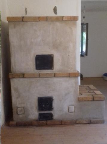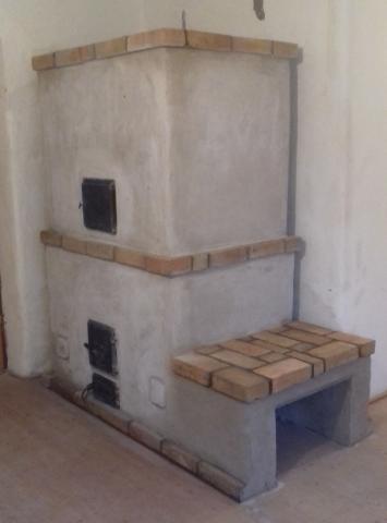És a kész kályha, vakolva, padkával és fatárolóval.