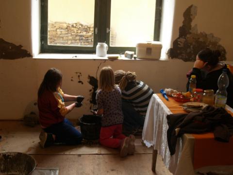 És itt egy szimbolikus lépés: a régi gázkonvektor helyét vályoggal falazzák be a fiatal kezek…